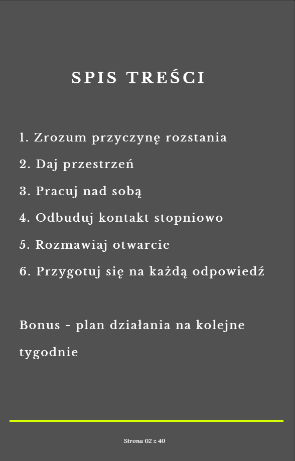 Chcesz odzyskać swojego byłego partnera, ale nie wiesz, od czego zacząć? Ten e-book to kompleksowy przewodnik, który poprowadzi Cię krok po kroku przez cały proces odbudowy relacji – od zrozumienia przyczyn rozstania, przez pracę nad sobą, aż po stopniowe odbudowanie kontaktu.